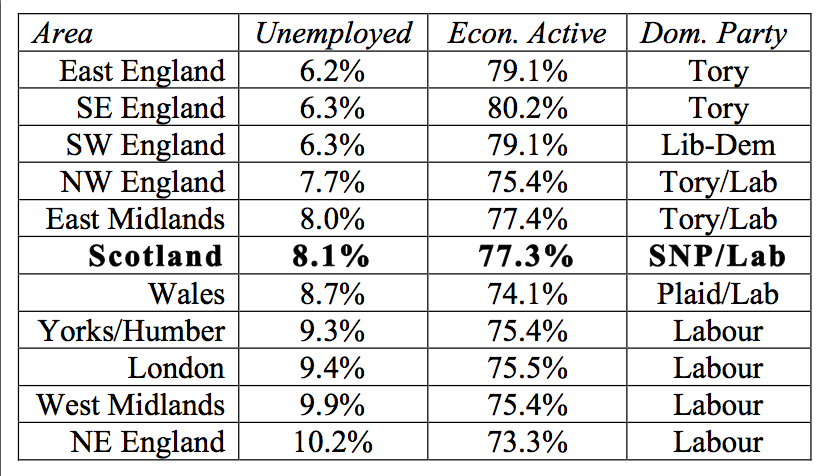 Looking more closely at statistics for the economic regions—as the Scotsman did—highlights a more subtle pattern. Labour rushed in to rubbish any positive reading of the favourable Scottish statistics but they would be better occupied considering why it is that, after over half a century of their dominance across much of the UK, poverty and economic blight should, from Dagenham to Dennistoun, remain the embarrassing hallmark of their dismal dominance. The table ranks UK ‘regions’ by unemployment.