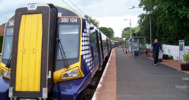 No sooner had I fired off the preceding EGIP post than I’m off to the station where I find one of two Class 380 trains already in service on the line since the 15th. Definitely a class act, these Siemens-built trains are not only faster, smoother and quieter but the interior is a huge improvement, with broader seats (4 across instead of 5), accessible loos, plenty of half-tables and (for the first time on ScotRail) power sockets for laptops and mobiles.