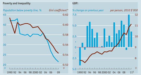 But it is not just scale, GDP per person, at around $11,000 (or 19,000 reais) has been growing at an average annual rate of 1.7% since 1990; closing the gap with high-income countries like Britain (currently $35, 165). But the key issue is that income growth is faster among the poorest—those in the favelas above São Paulo or scraping a living in the newly cleared forests of the Matto Grosso.