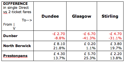 It is hard to believe that everyone at ScotRail is so innumerate as not to see the public relations disaster of such an illogical structure so the only logical conclusion is that it is a wheeze to milk extra money from their customers without their realising that they are paying up to 25% over the odds. And, before you celebrate that Dunbar’s getting a deal on direct tickets, see above where they are already getting fleeced 40% more than other ScotRail customers. Only their best deal (Dunbar-Glasgow) saves them that 40%.