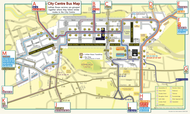 - Visiting Scots. If you’re a pensioner with a Scottish Concession Card, it’s as easy as the native, with the same transfer drawbacks. However, the system presumes you already know how to use it. Route maps are rare even in bus shelters so you need to know which bus goes where. Then the centre of Edinburgh is a maze of bus stops (even before any tram works—see below). Finding the right stop is hard because (unlike London) there are no helpful maps of surrounding bus stop locations. This is made worse by a propensity to scatter them. Getting off a train in Waverley, it’s half a kilometre walk to catch a 10/11/16 past Tollcross because the stop is at the Mound. Those with no card have to fork out £1.40 to go any distance and do that again if they transfer. A Day Ticket is available, but at £3.50, it’s no bargain until you make a total of four journeys or more that day.