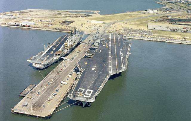 HMS Ark Royal (left, with 'painted-on' angled deck) berthed with USS Nimitz (right, with the real deal)