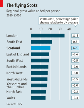 “Scotland’s accounts of revenue and expenditure, based on Treasury data, show that it is not a ward of the state, grossly subsidised from Westminster. In fact it performs better than all regions outside the south-east of England, and has done particularly well in the past decade. In 2010-11 Scotland’s GDP was £145 billion ($225 billion) including a geographical share of North Sea oil and gas, around 10% of Britain’s, with 8.4% of the population.”