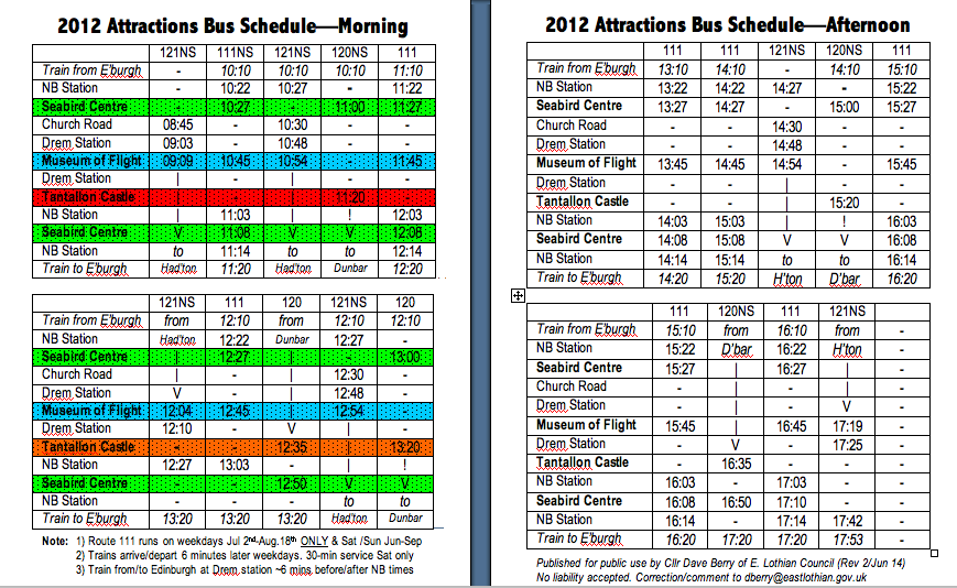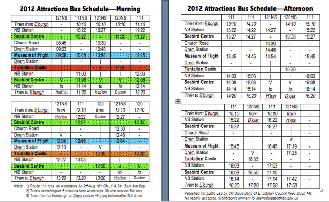 So, yesterday was the day I tried to boil this mess down into something palatable. I tried to think like a tourist as to what could make a visit as easy as possible and came up with the formulation below. Whether anyone who gets to the Museum of Flight could also visit Tantallon Castle in one day, let alone see all four attractions, is questionable. This timetable is still deeply flawed and I welcome suggestions for improvement.