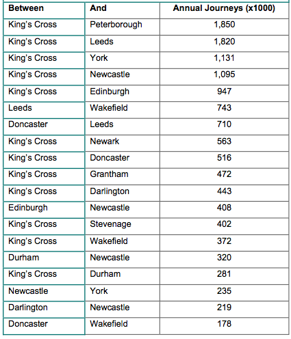 This shows by far the bulk of journeys to be in England. No service North of Edinburgh registers and Edinburgh makes it on the list only through its traffic to London and Newcastle. Oddball situations like Dunbar do not register at all.