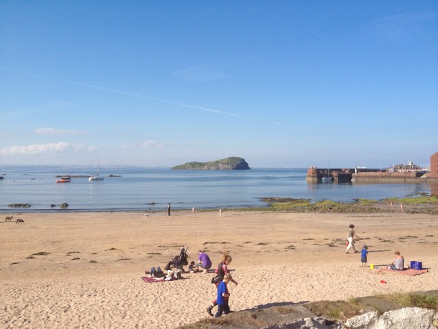 Today was one of those idyllic days when the sea seems so azure and inviting that it’s not just the kids that are tempted into the water. Trains were pouring hundreds of people into the town (lucky for them—parking spaces were like hen’s teeth), the High Street and harbour were mob scenes and emergency supplies of ice cream had to be blue-lighted down from Luca’s in Musselburgh.