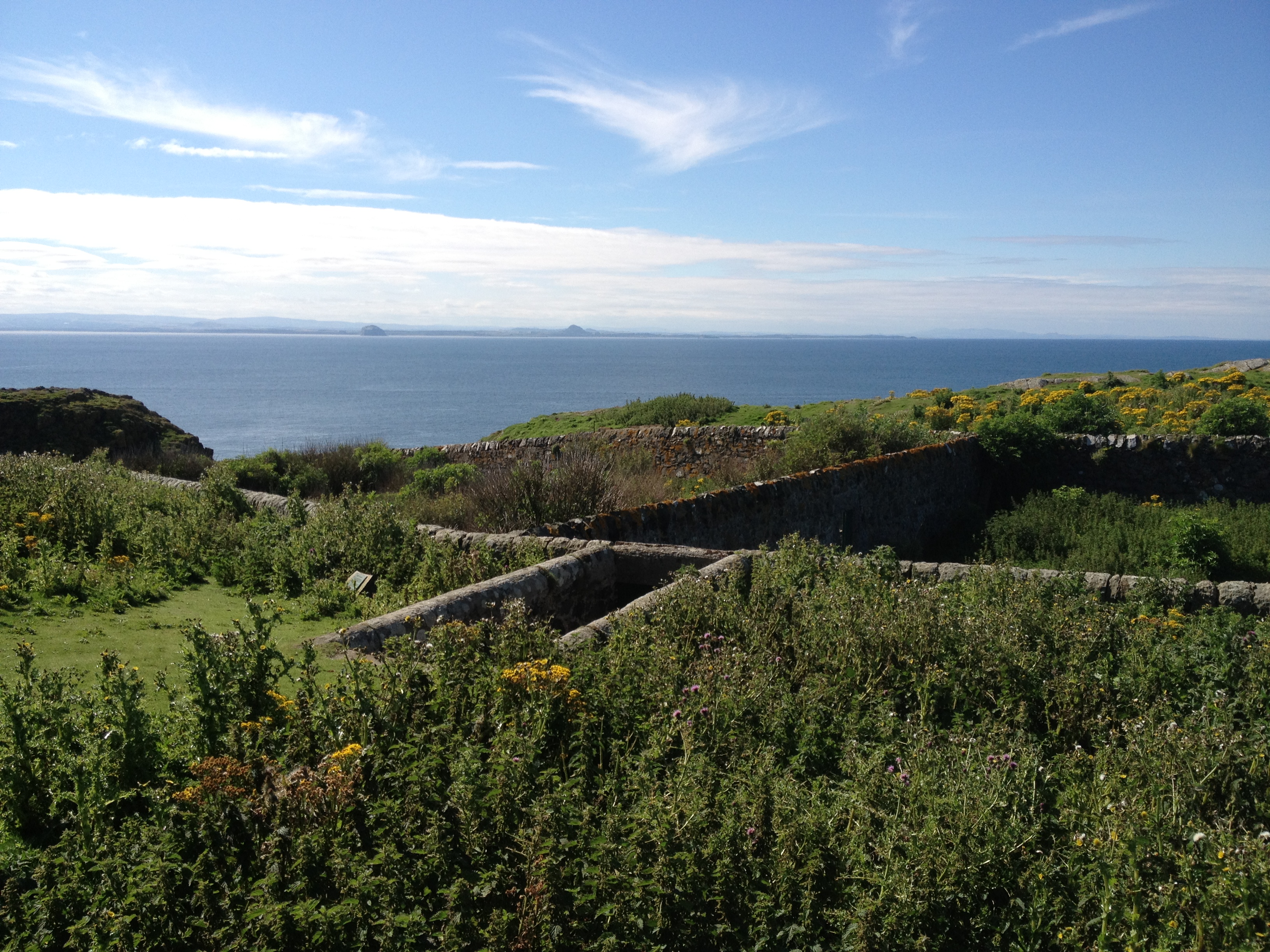 View SW over walled gardens (once used for vegetables by lighthousekeepers) towards Bass Rock & Berwick Law