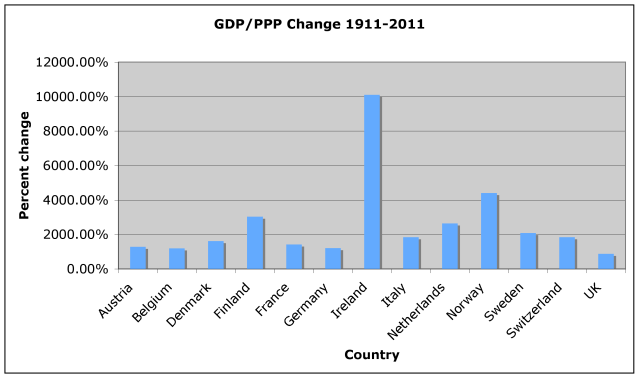 Most interesting of all are the countries that barely existed 100 years ago. Norway had just recently asserted its independence from Sweden in 1905; since then it has come on a whopping 4,409%. Finland would break from being a province of Imperial Russia during the mayhem of their revolution in 1917, after which it has managed 3,030% growth.