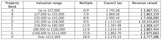 This raises around £39m in Council Tax. John’s ploy to increase this is to split each upper band (E-H) in two so as to give bands E-L but to continue the proportionate ratcheting up of the ratio (3rd column) so that band L would be paying 36/9ths or 4 times as much as Band D. This does accrue appreciably more tax, with all of the increase coming from above Band D. But this hits the middle class (houses in the £58,000 to £212,000 valuation range) hard, compared to now. But it still doesn’t nail the many houses valued well over £212k.