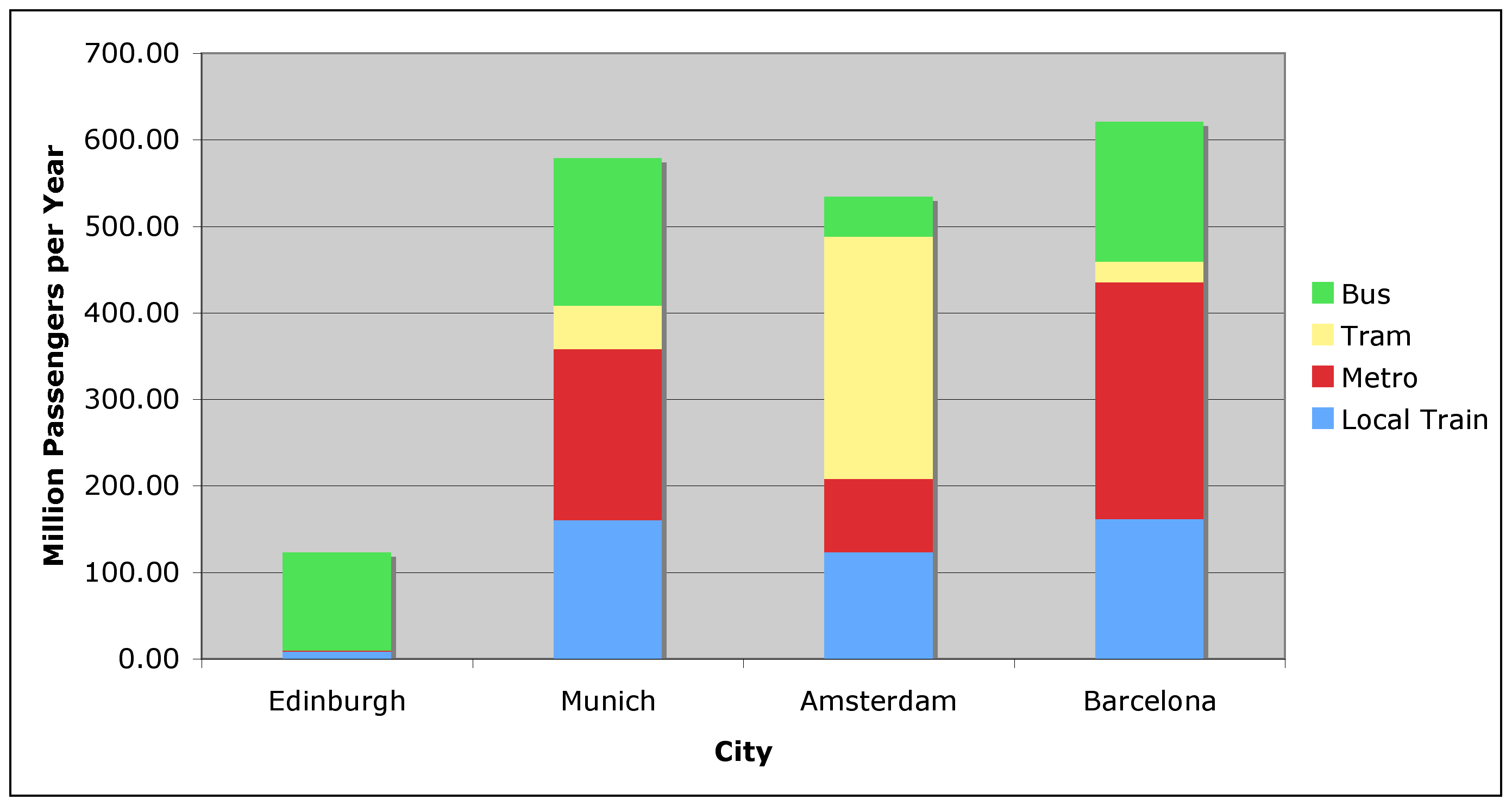 Reliant almost entirely on buses which are then choked by the cars people use in frustration, Edinburgh is a pygmy in transport and decades behind comparable cities. Even allowing for its population (500,000) being the smallest of the four, its still grossly outclassed per head.