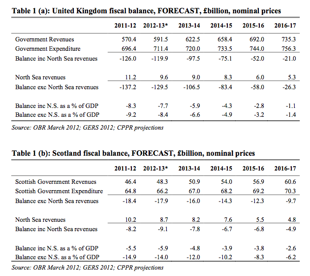 By now, everyone knows that North Sea oil tax revenues—and therefore much of the theoretic initial economic vitality of an independent Scotland—depend on oil prices. Based on OBR numbers, the CPPR originally came up with a table showing short-term results for both the whole UK and for Scotland alone thus: