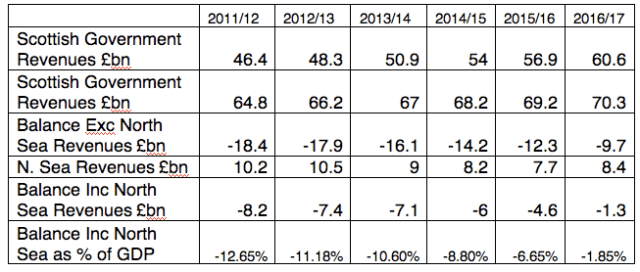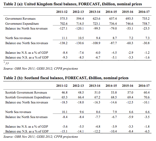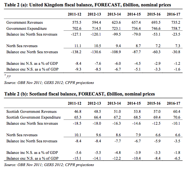Not only do such tables show what appear to be optimistic forecasts for the UK’s revenues within 5 years (by 73.5% while Scottish revenues rise only 60.4%) but they predict an independent Scotland and a UK both running 1-2% imbalances by 2016/17. In other words, Osbo’s right; hang tough; we’ll come out of this better together.