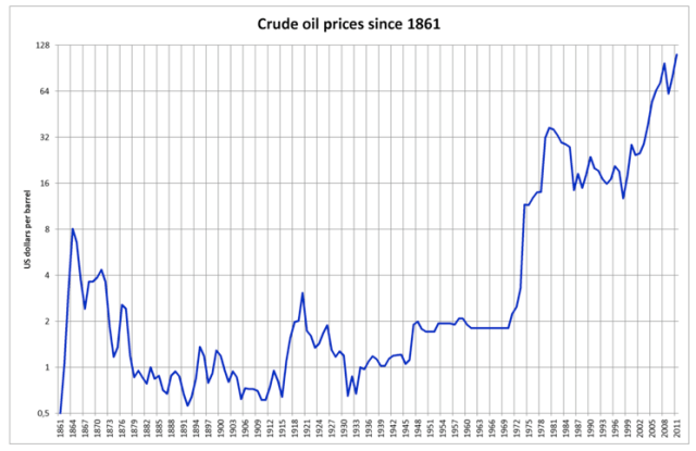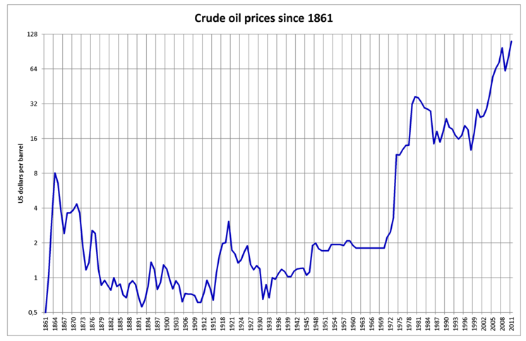 Given that (if you remove the oil shock ‘bumps’) oil prices have climbed pretty steadily for decades, as shown in the logarhythmic chart below. Note the laughable price for most of the 20th century and the effectively steady climb since the 1973 oil shock.