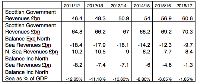 This shows the UK descending into a negative GERS balance of -£144bn last year, with oil excluded (as 90% of it would be Scottish). This massive -10% balance compares to figures for Scotland that are -£10bn or -7.4%. In other words, a separate Scotland may show a negative balance but it’s only 3/4 of what it would be as part of the UK.
