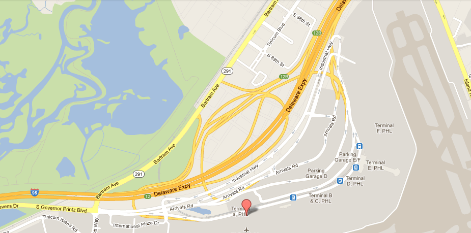 Starting at the red marker shown and going right, there is the usual sequence of terminals A through E but there the logic ends. Approaching on the Delaware Expressway (Interstate 95) from North or South, there are signs for Arrivals and Departures but heaven help you if you choose the wrong one or if you are looking for, say, a specific car rental or a specific hotel. Mulitstorey car parks obscure all information about terminals and so, often as not, you find yourself at the end of options faced with I95 N or S and precious little else.