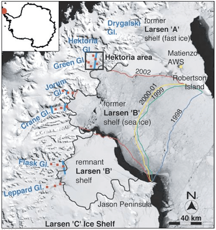 Recent History of the Disintegrating Larsen Ice Sheet: Red Line is the New Coast