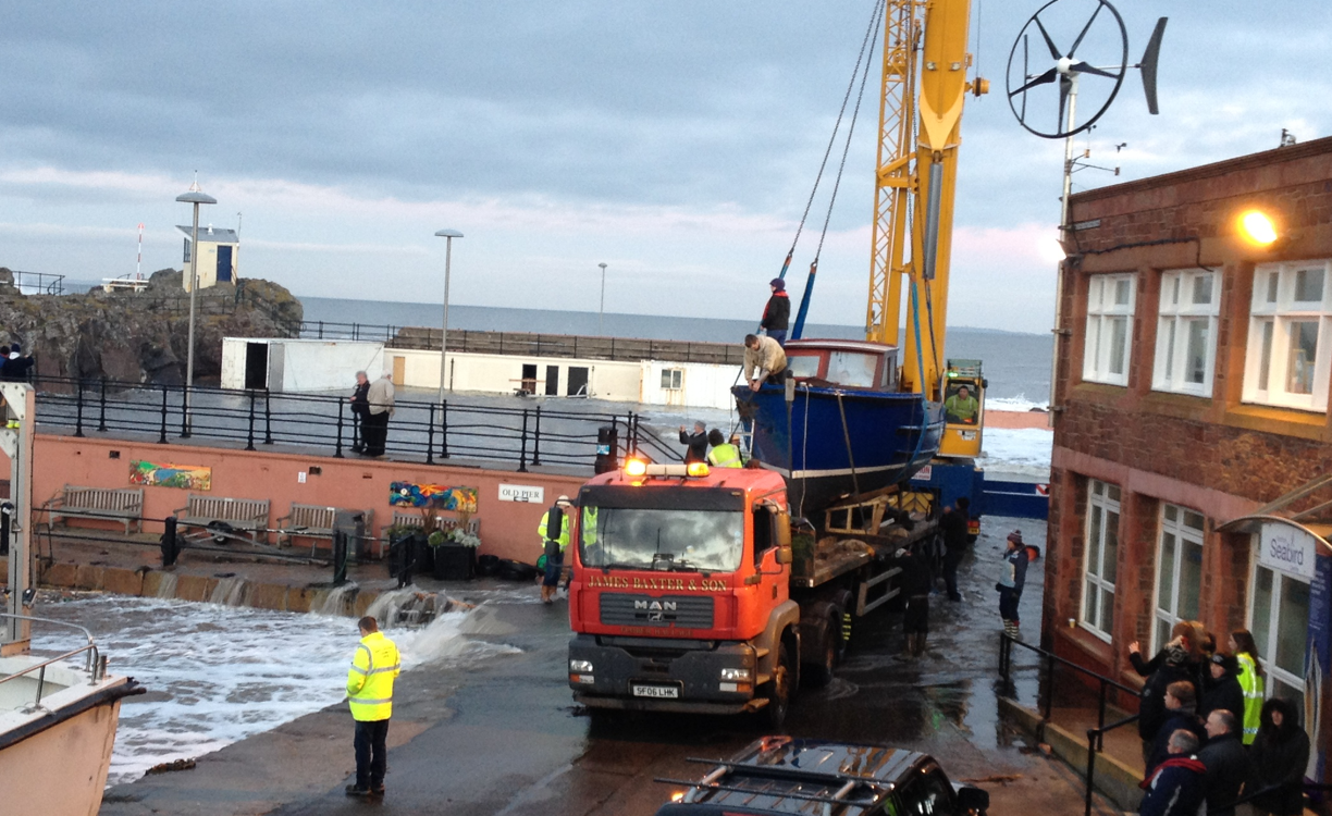 Here it fetched up against the yacht Borecay, standing on its cradle on the quayside. The metre-deep water pushed Borecay off its cradle and against the harbour railings so hard that they gave way and everything piled into the harbour on top of the boats moored in the SE corner. Meanwhile, the Girl Pat, sitting at the west end had been floated off its blocks and was driven against the old pool cubicle block so high and so hard that it bent the railings along the top, which stove in much of her starboard side. Local people have taken this particularly hard: this was Chris Marr’s boat.