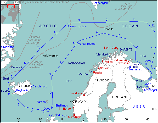 Things got going in October 1941 when PQ1 of 11 ships left Iceland. Initially not much molested, as the season changed to winter, the bitter conditions were bad as any enemy. Sea spray froze into ice on the superstructures; this had to be chipped away or ships would capsize (HMS Shira lost this way—3 survivors). To touch anything with bare skin was to lose it, freezing to metal immediately as if glued. From November on, passage was in 24-hour darkness—a blessing because pack ice forced the convoys south towards the Norwegian coast so the less German patrols could see the better. (See here for details of convoys).