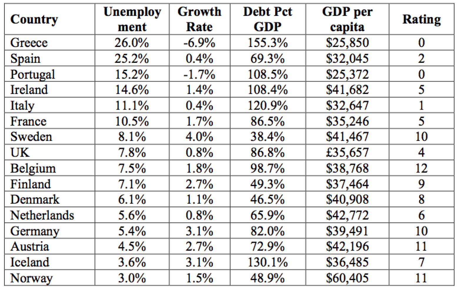 Comparing the UK with other developed countries is one way of creating some kind of objective measure of this. While numbers don’t tell you everything, the level of unemployment, the health of the economy and the degree to which the burden of public debt is manageable are all related indicators to say what a country can afford. Table 1 lists a selection of European countries whose economy is some form of yardstick for the UK’s.