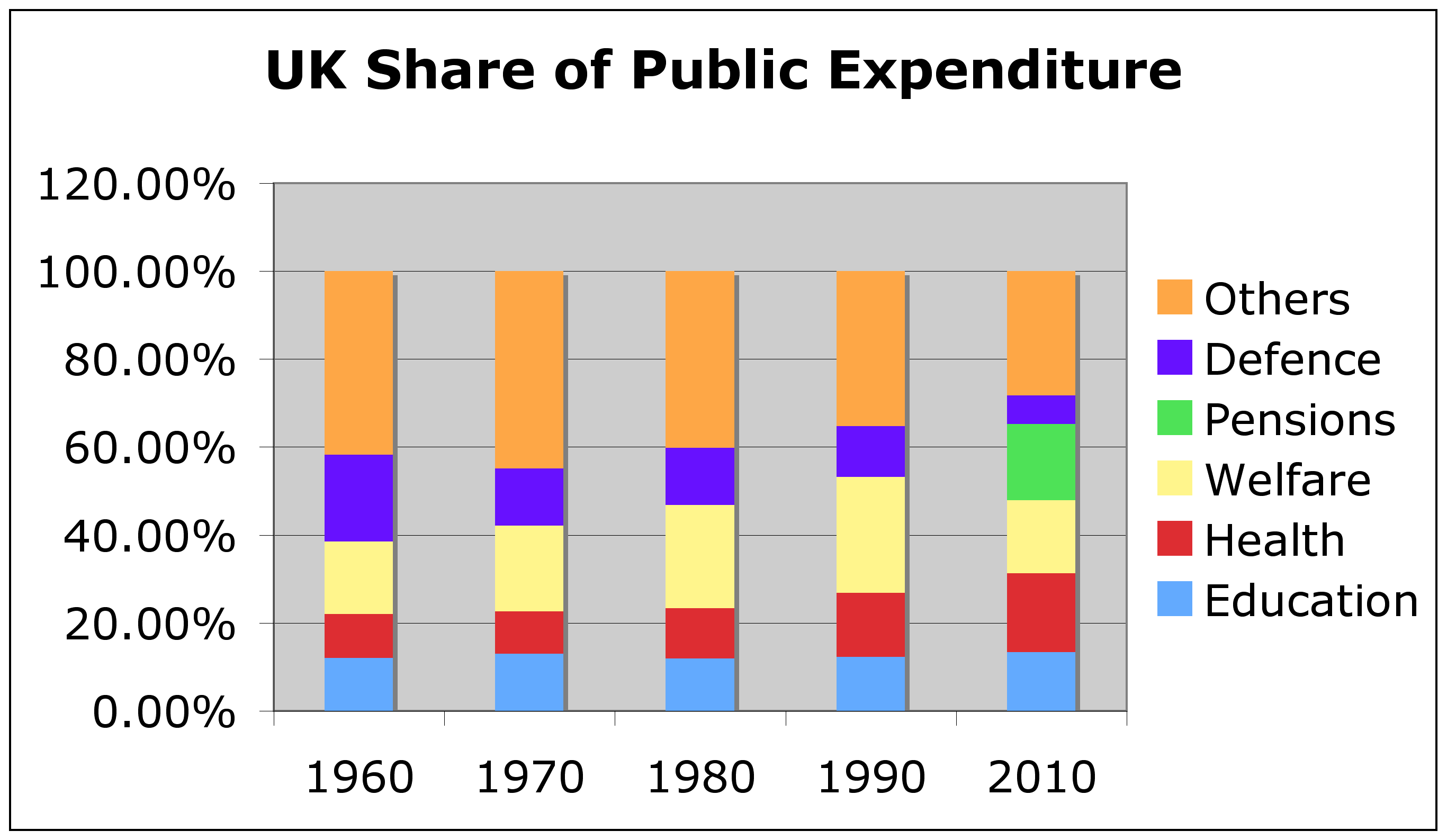 From a total of £9.1bn in 1960, it has mushroomed to £660bn in the first year of the present government. The chart shows the key social provisions broken out (Health, Welfare and Pensions), together with Education (a fundamental requirement) and Defence (a more optional requirement). Note that Pensions were self-funding until the last decade since when they have become 17.3% of expenditure—bigger than Education at 13.7%. In order to better compare things over time, let’s redraw the above in terms of percentages to show which have grown or diminished (Chart 2)