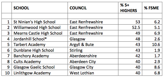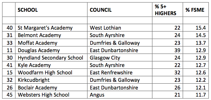 Only two have changed since last year. Impressive results as these are, there is a large variation in their associated FSME stats. If this were so decisive, why would Banchory not beat St Ninians as they have a quarter of their FSME? How do Tarbert or the Gaelic School do so well, despite 1 in 10 pupils entitled to FSM? Ansd what about those with substantial FSME? Take the highest 10 of these within the top 50 in exam achievement gives the following table: