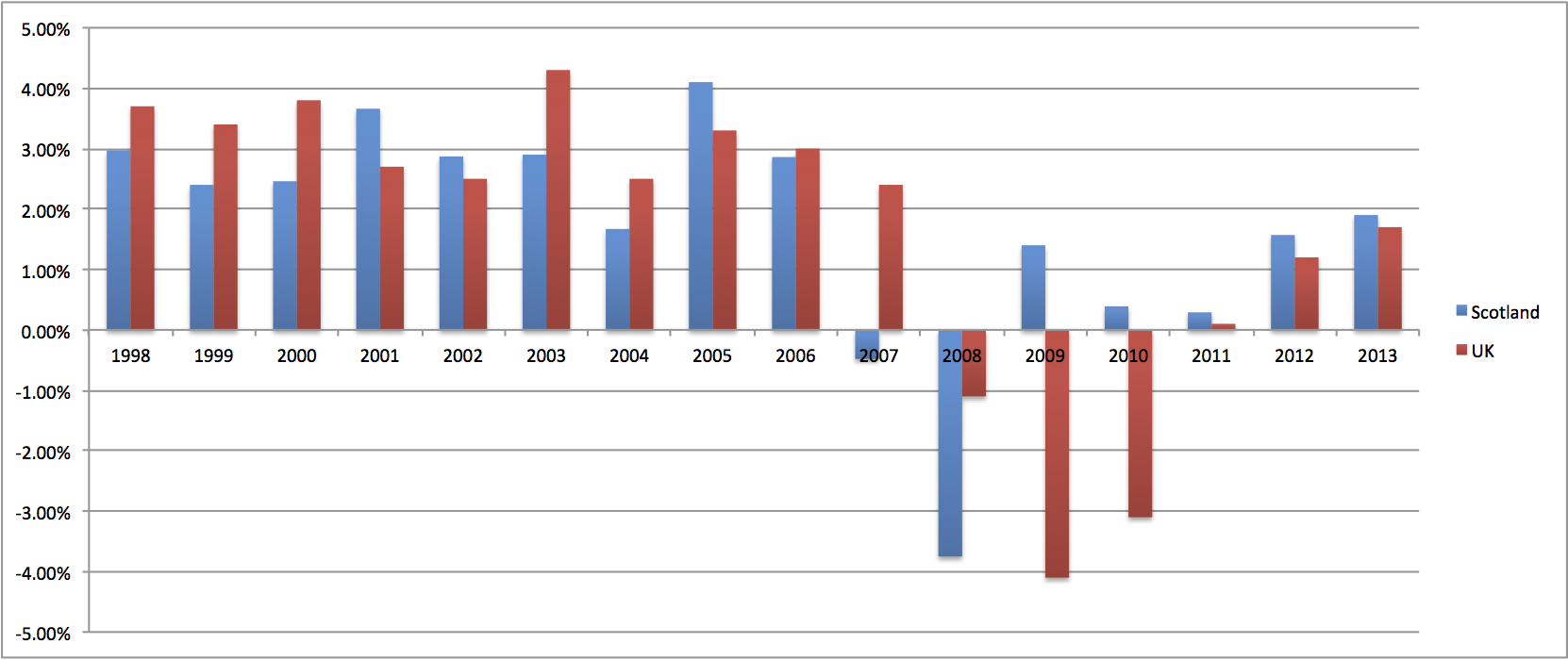 Clearly, Scotland grew at a rate comparable to the UK until the recession in 2007. At that point, we were initially hit far harder but recovered faster and continue to do so. Indeed, Scotland’s economy appears more robust than the UK (i.e. England’s) and a strong case can be made that they need Scotland to keep them afloat.