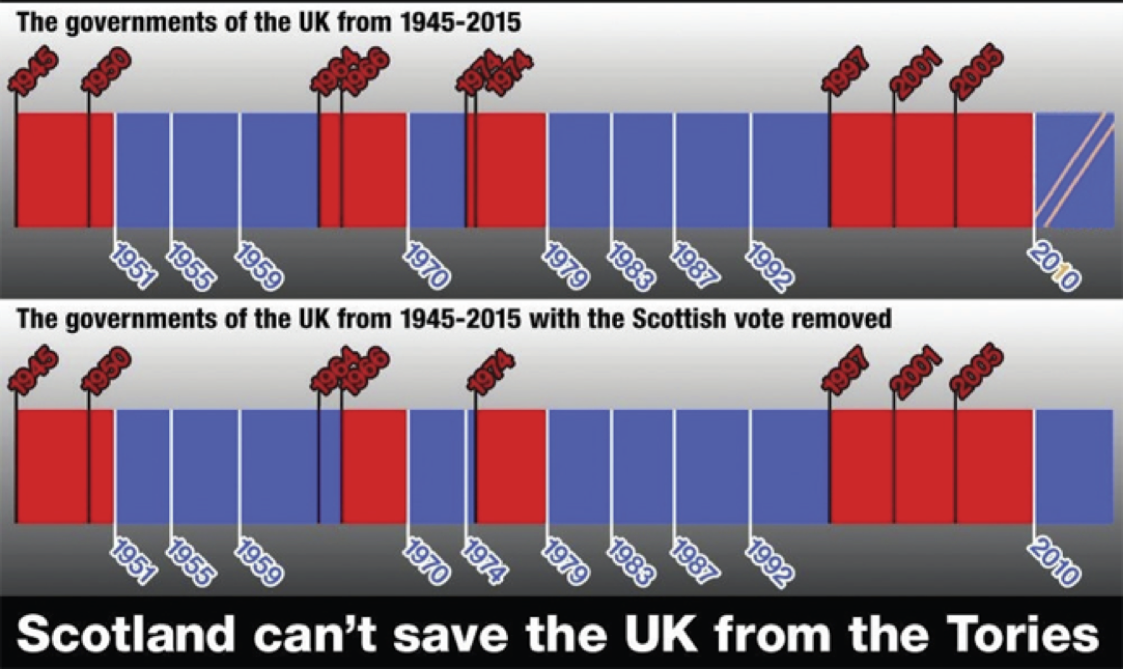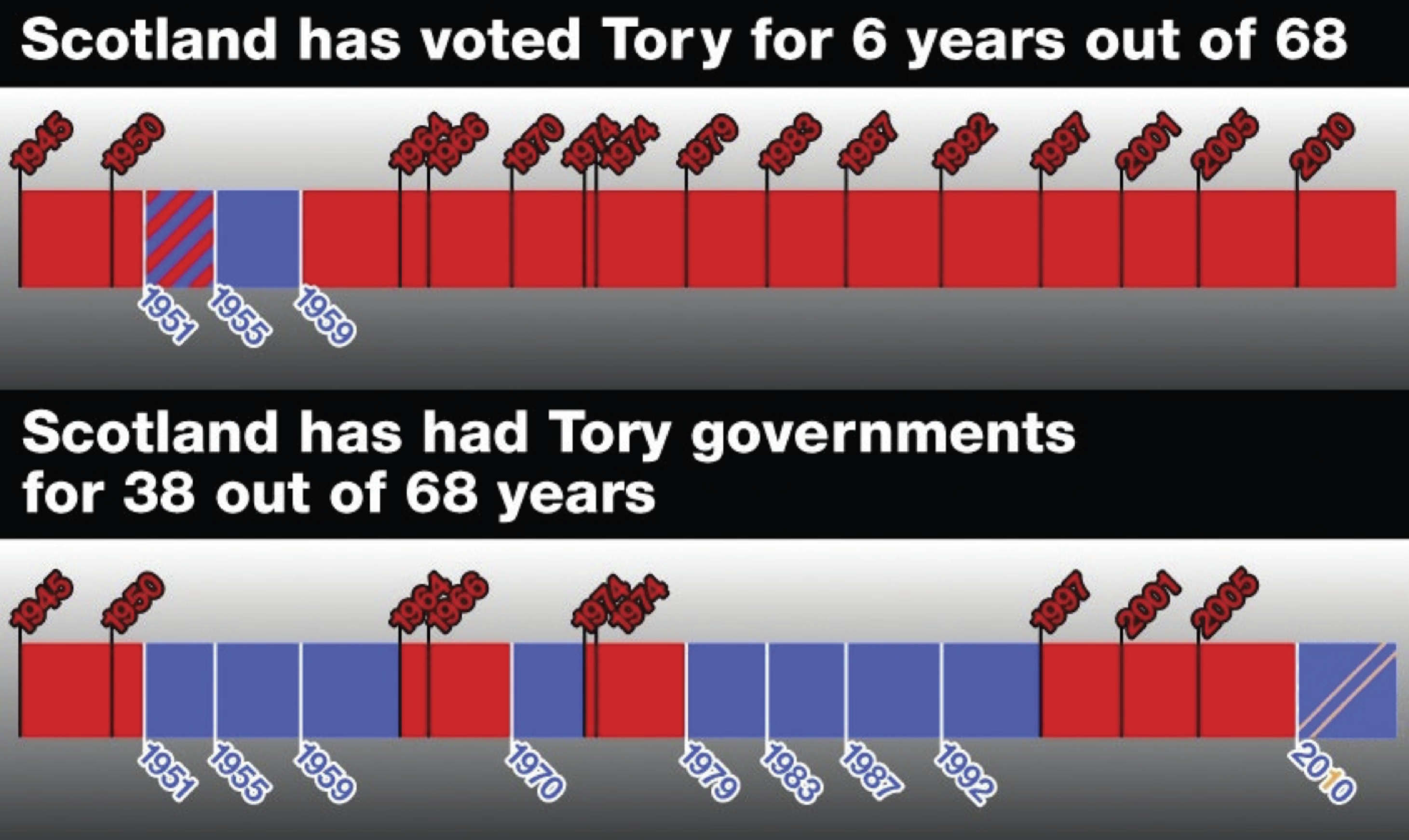 This is perhaps the simplest aspect of the debate to deal with. Scotland rarely – less than half the time, in fact – gets the governments it votes for. Scots have voted for Labour at every Westminster election since 1955, but by the time of the 2015 election will have had Conservative governments they didn’t want for 38 of the last 68 years.