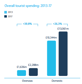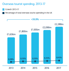 Those international visitors are expected to increase the proportion of their spend in London from 62.9% to 64.0% by 2017, a stunning £15.1bn total. The only other UK ‘region’ to increase its share of the cake is Scotland—from £1.6bn to £2.4bn and taking 8.5% to be bigger than any other English region, N. Ireland or Wales. Total tourist spend in Scotland is expected to top £15bn by 2017. Opportunities, indeed.