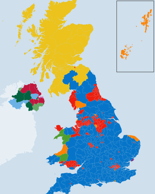 Reporters made much of the divergent colours between England and Scotland as virtually all the 59 tiles representing Scottish constituencies turned SNP yellow. But the 18 tiles for Northern Ireland were coloured a mix of ‘Other’ parties, as they have for a century—which was reported as normal. Wales was the only one of the four looking vaguely like England, made the more so by three more Tory seats—and 27% representation there.
