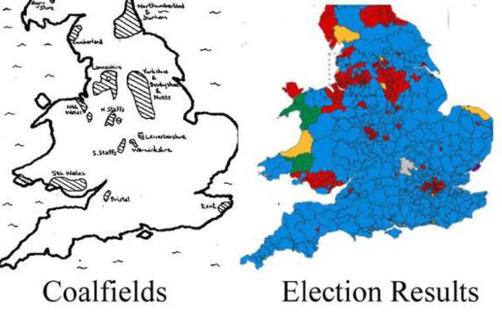This underscores the degree to which Labour in England was unable to break out of what has been its traditional heartlands where heavy industry and mining once dominated. Pat Kane tweeted an even more graphic map of this phenomenon by comparing the areas of Labour support in England with the distribution of former coalfields, as shown.