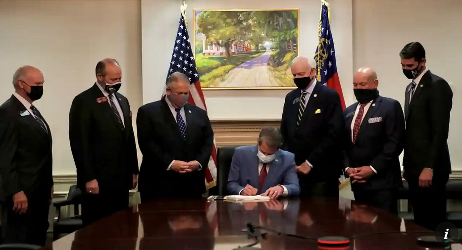Georgia Governor Brian Kemp signed his state’s new voter suppression law last night in a carefully staged photo op. As journalist Will Bunch of the Philadelphia Inquirer pointed out, Kemp sat at a polished table, with six white men around him, under a painting of the Callaway Plantation on which more than 100 Black people had been enslaved. As the men bore witness to the signing, Representative Park Cannon, a Black female lawmaker, was arrested and dragged away from the governor’s office.