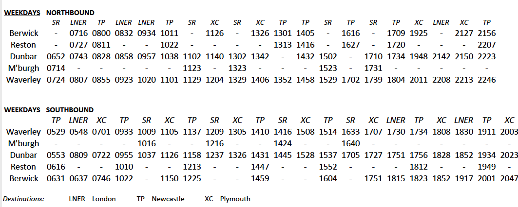 These are run by LNER (London & North-Eastern Railway), TP (Transpennine Express) and XC )Cross-country). Only TP stops at Reston, with the others providing a more frequent service to Dunbar.
