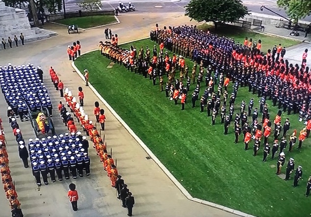 The whole event went off with military precision. The planning had been impeccable; uniforms were vibrantly resplendent; Whitehall and the Mall provided ceremonial backdrops; nobody in the 3,000+ in the parade put a foot wrong; the crowds cheered and threw flowers. It was a global showcase of Britain at its best.