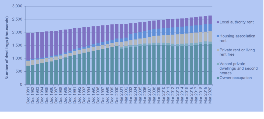 The cause of this crisis is not hard to find: there are simply not enough homes available, especially at the affordable end of the market. This originated 40 years ago in the right-to-buy policy. Though the principle itself is good, requiring councils to set ALL proceeds against debt made building replacements unaffordable. Over the next four decades, council tenancy fell steadily from 54% to 12%. Private ownership and rentals both doubled—to 1.42m and 334,000, respectively. See Figure 1 below (Source: Scottish Government).