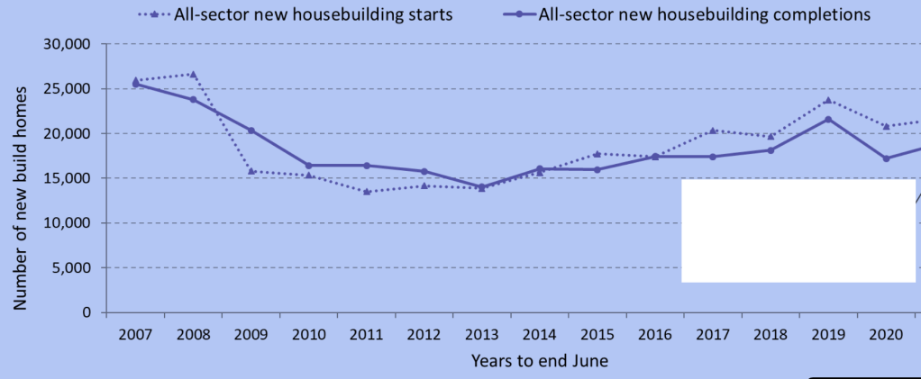 Sounds great? Actually, the previous year’s build had been crippled by Covid-19. The figure for the year to March 2020 had been barely 14,000 of all types, a steep drop from over 21,000 the previous year—and making the 2022 figures look stellar. This also compares poorly with private completions of over two-and-a-half times that (17,225). This imbalance of affordability is not clear from official charts showing overall figures, such as Figure 2 below. (Source: Scottish Government)