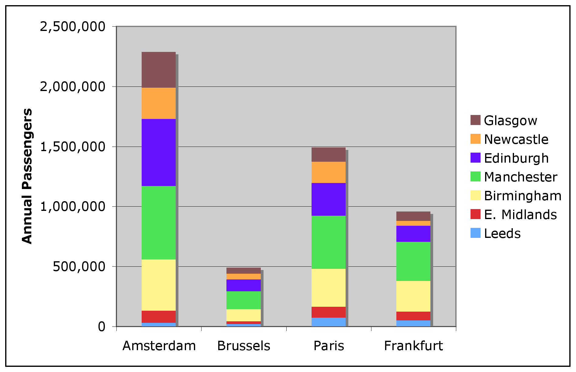 Oh, really? There is no real need to wait for any HS2 for this ‘other 80%’ to start exploiting fast rail to Europe. Booming Continental air traffic from everywhere North of London is a clear sign of the demand. An overview is shown in Chart 1.