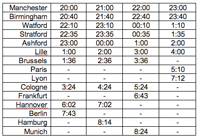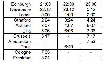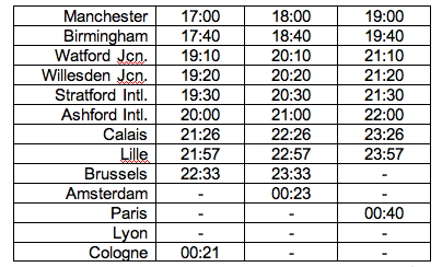 If such services ran at Eurostar/ICE/InterCity225 speeds, all of the above could be encompassed through using the currently unused 33% capacity of HS1/Chunnel. Draft timetables are shown below.
