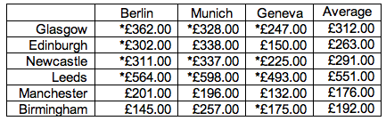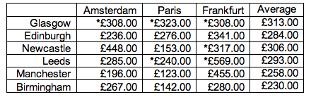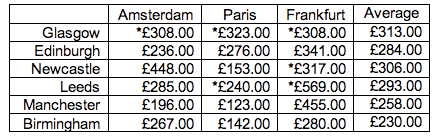 Table 4—Current Cheapest Air Fares to Near Continent (*no direct flights)
