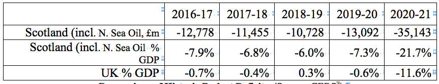 This quote from unionists in 2016 was based on a fall of 97% in tax revenues from North Sea Oil from £1.8bn in 2015 to £60m in 201. This dismissive attitude toward what contribution the North Sea could ever make to the finances of an independent Scotland has been repeated and compounded by increased deficits due to measures to cope with Covid. Budget balances over the last five years is shown in the table.